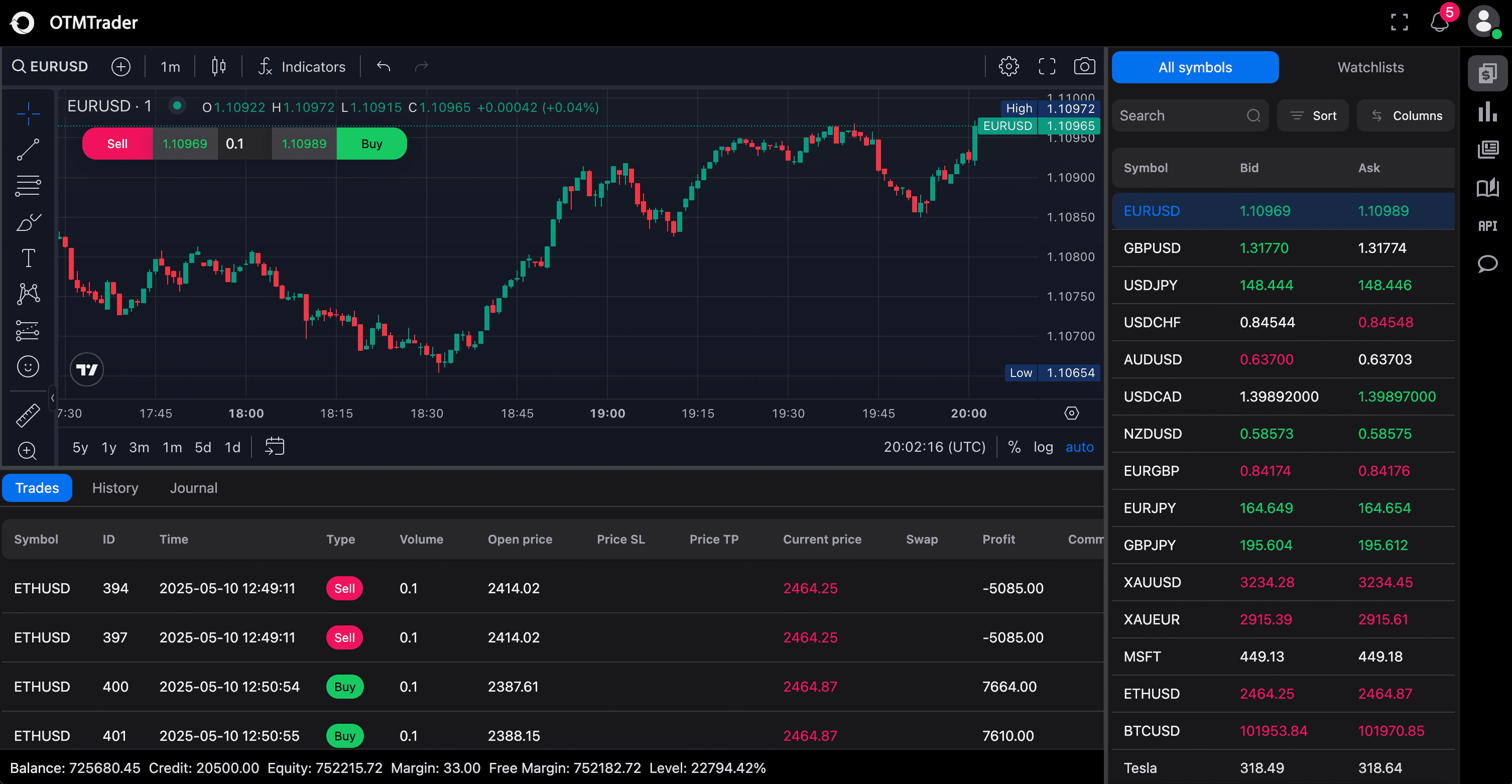 منصة OTMTrader قوية وبديهية، وتجمع بين الميزات والأمان الرائدين، والتنفيذ فائق السرعة، وأفضل الأدوات للتحليل والرؤى. لقد صُممت لدعم استراتيجيتك - وبُنيت خصيصاً للمتداولين والوسطاء الأذكياء